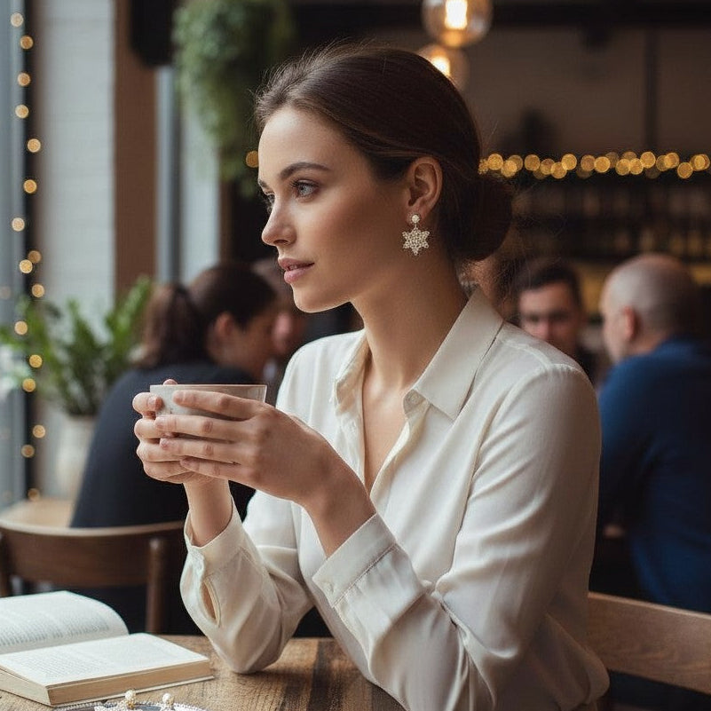 Add a touch of elegance to your winter wardrobe with our 1.5-inch Gold Snowflake Earrings. Featuring delicate clay filigree snowflakes and dainty pearl tops, these earrings are perfect for dressing up cozy knits or holiday outfits. An enchanting gift for women who love artisanal, seasonal jewelry with timeless charm.
