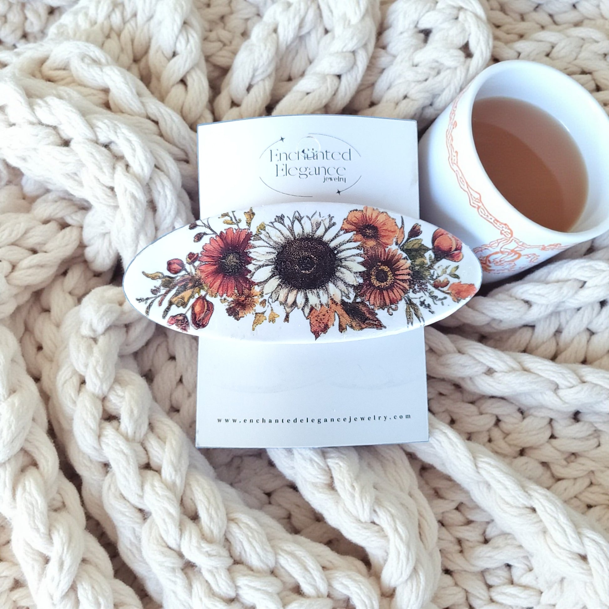 Capture the warmth of autumn with our White Sunflower Hair Barrette. Featuring a vintage-inspired sunflower and floral design, this handmade piece adds rustic charm to your hairstyle. With a secure 4.1" French barrette closure, it's perfect for everyday wear, fall weddings, or cozy seasonal looks that celebrate handmade beauty.